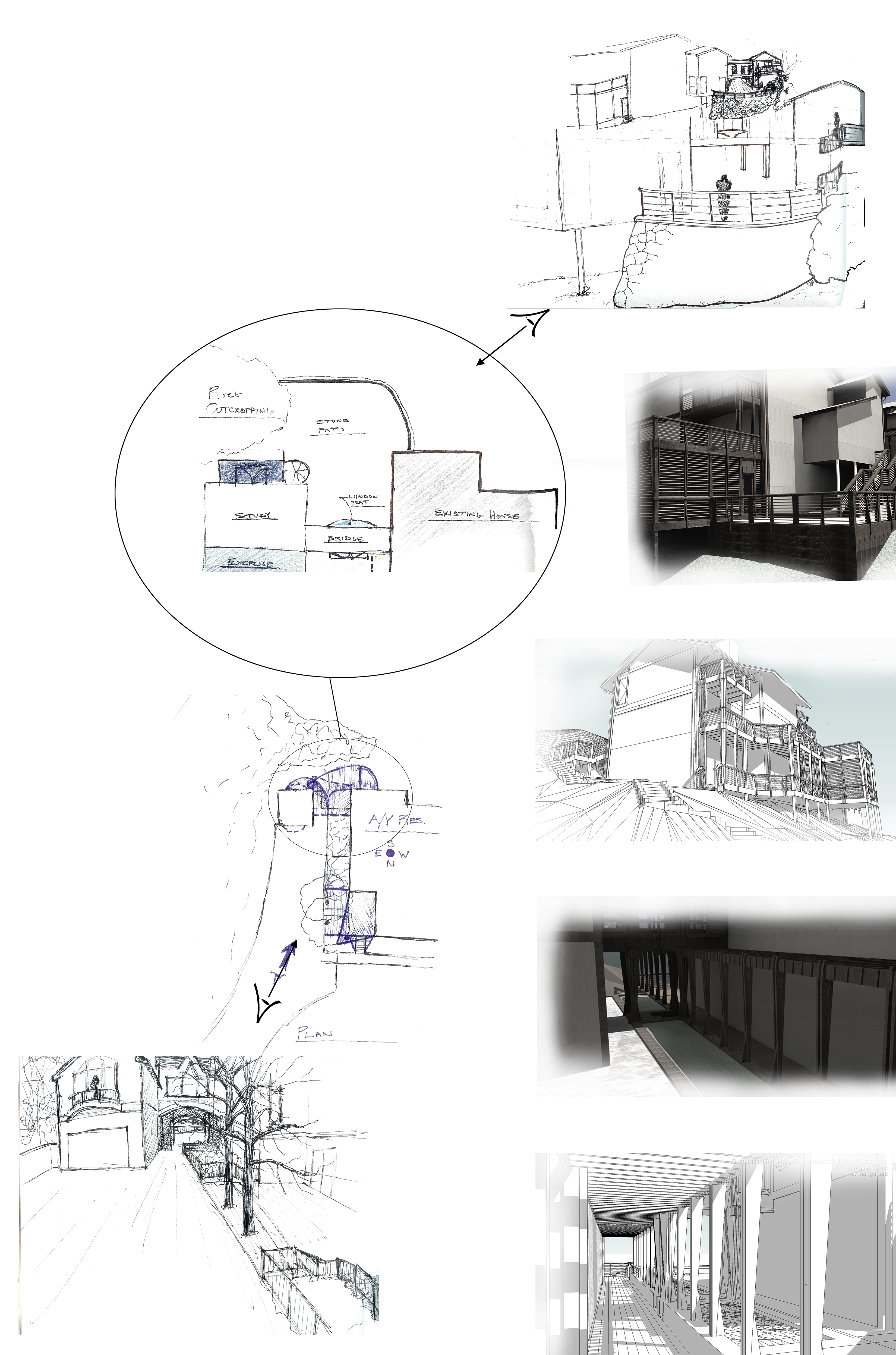 conceptual design for sprucing up a mountain home, primarily by redoing the porches, balconies, and walkways