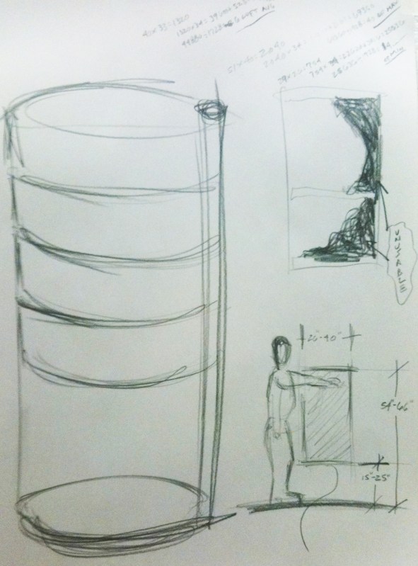 graphical exploration of the easily reachable zones in a refrigerator, realization that much of a refrigerator is difficult to access, and a design idea for making all of it easy to access
