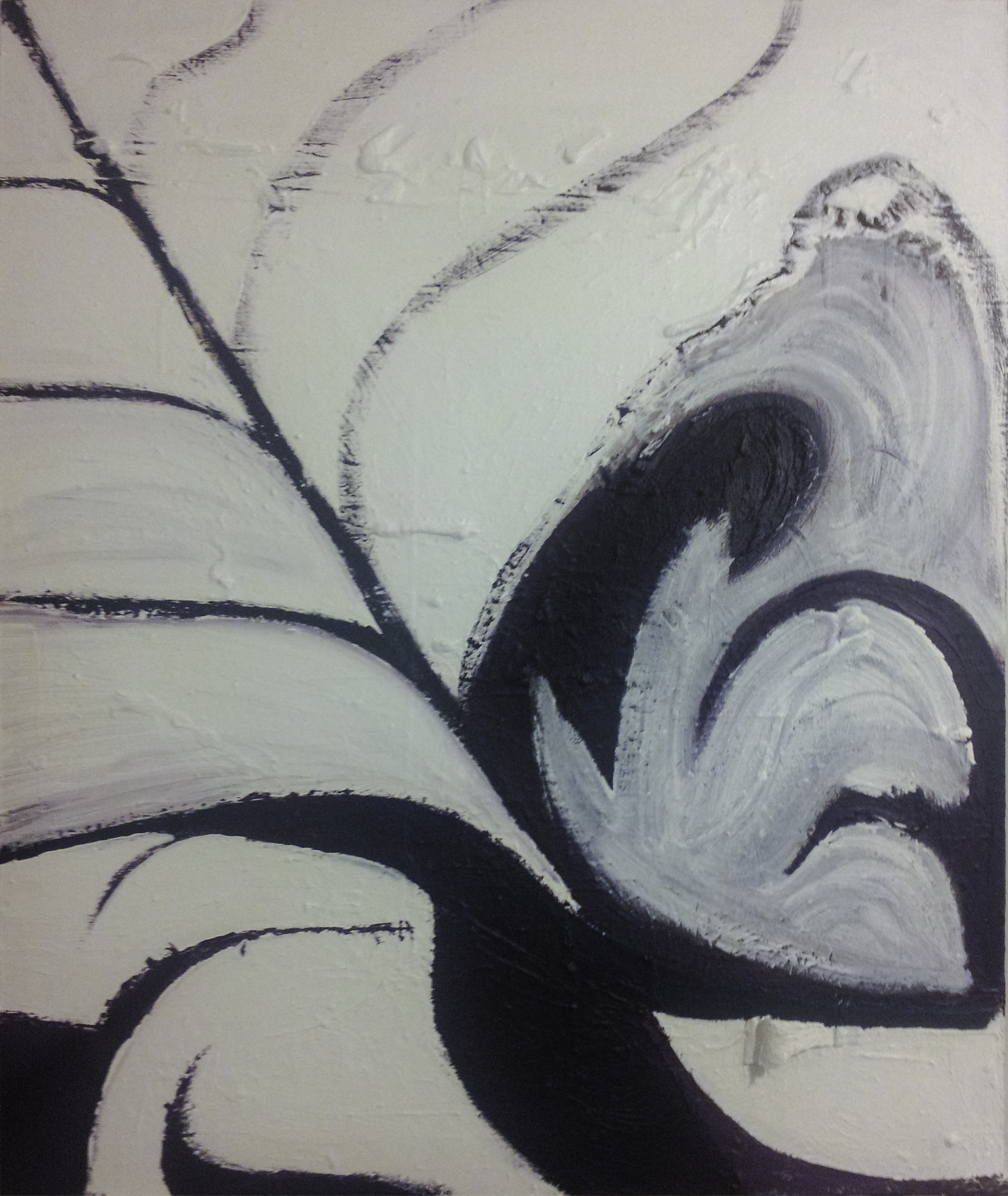 Marriage and moving intervened and work ceased. Then it found a place on a wall and I became busy. Also, I did not know how to move it forward. Seven years passed. I looked at it daily and reflected on it. The story and meaning evolved, but not the painting. Early in 2012, I decided that I had to get going again, even if I didn’t know where to go with it next. I accepted that it may have to be a bit awkward while we reconnected with each other and found a way to move forward together. I began by tracing over flows and composition with a dry brush, just to reconnect with it in a visceral way. Next, I dove in and began highlighting new aspects of the composition (as seen above), looking for the way forward.