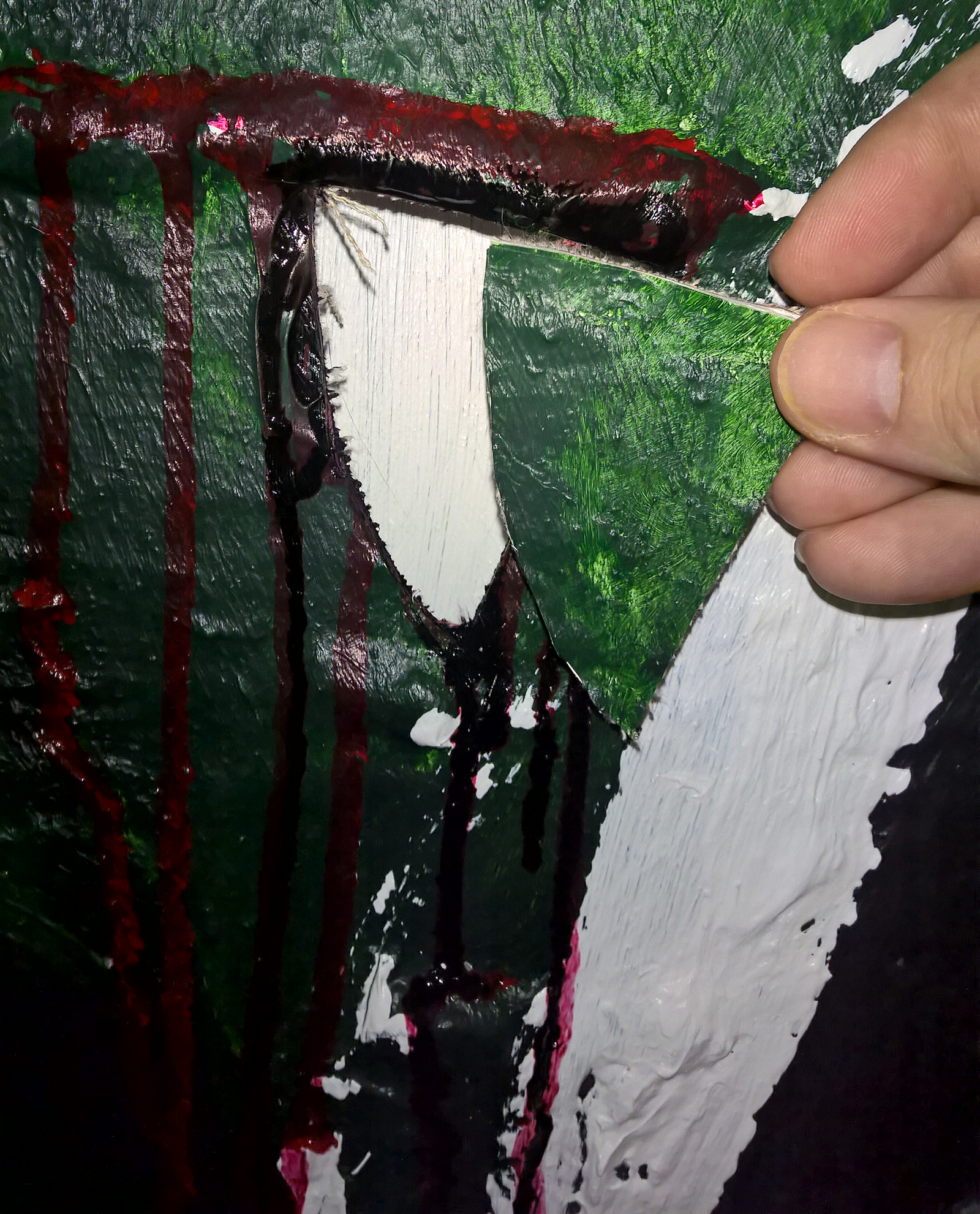 Re-engaging the PfL became part of the healing process from the trauma of betrayal, retaliation, and defamation. It was appropriate that I began painting again at this time. Painting became part of accepting the loss and healing. The pain and loss was commemorated in the painting by cutting a piece of the painting out. This represented the damage done by the betrayal and retaliation and defamation. The idea was that I would paint over the canvas until the hole was filled in with thick-bodied paint. There would be a visible scar, sure, but there would also be healing and renewal and a new direction through the process.